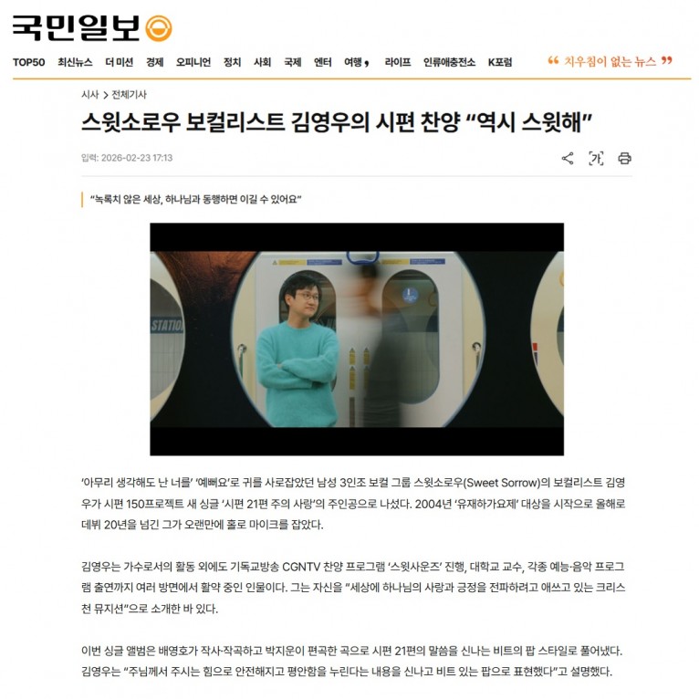 [기사] 스윗소로우 보컬리스트 김영우의 시편 찬양 “역시 스윗해”(국민일보)