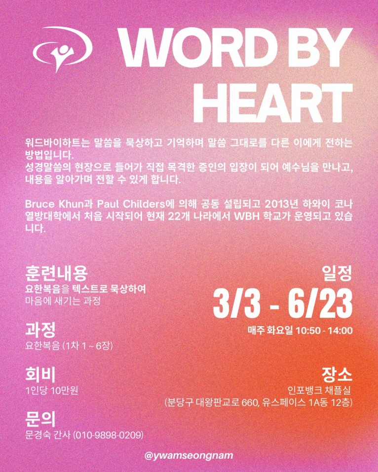 예수전도단 성남지부에서 ‘WORD BY HEART’(이하 WBH) 과정을 이수할 학생을 모집한다.