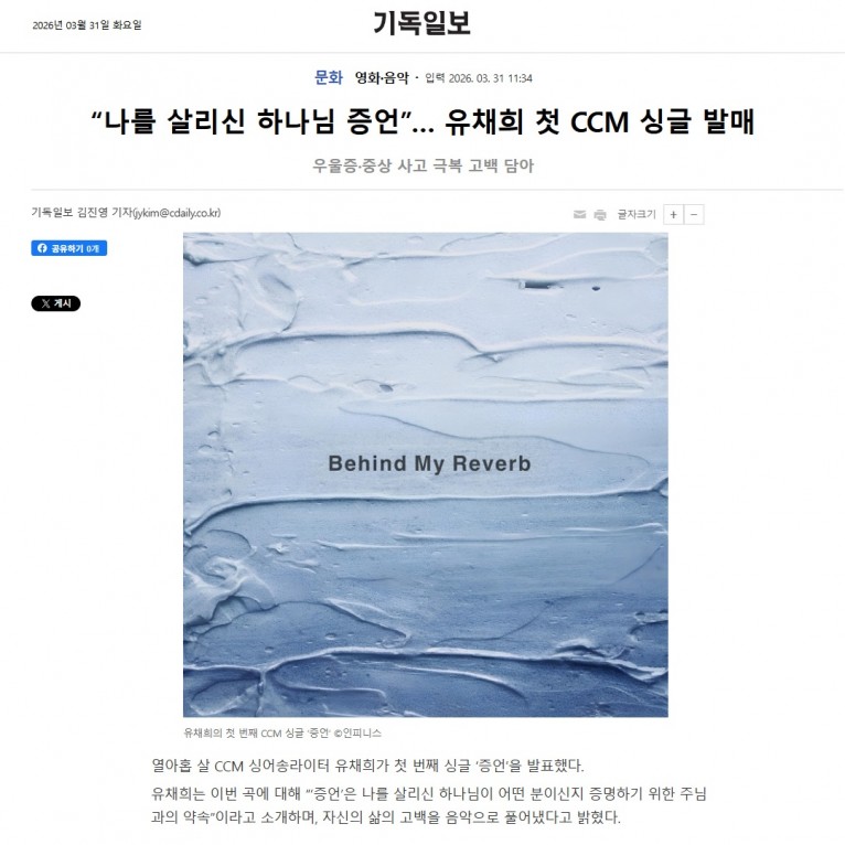 [기사] “나를 살리신 하나님 증언”… 유채희 첫 CCM 싱글 발매(기독일보)